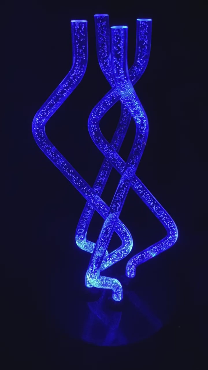 This unique kinetic sculpture from Creative Motions features 4 "L" forms that rotate amongst each-other but never touch! Further adding to the excitement, each one is illuminated with RGB LEDs that slowly cycle through the color spectrum.