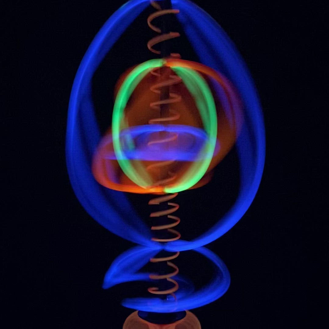 A very rare item! From a time when Spencer Gifts was “invaded” by Planet-Time products. You could find this item sitting amongst the Techno Discs, Cosmic Windows, and Mini Orbiters. This unique and rare Spintrix unit is in amazing and beautiful shape. Add a blacklight and the real fun begins! Each flexible plastic tube can be changed to create any blacklight reactive shape you desire!